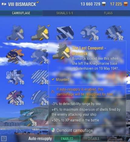 4. 使用“俾斯麦改二”涂装需确保使用了完好的猎杀俾斯麦任务奖励迷彩: